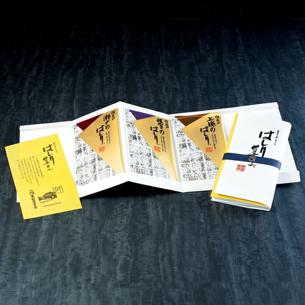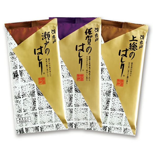 日本を代表する三大漁場で採取した初摘み海苔、 「佐賀のはしり」「上総のはしり」「瀬戸のはしり」を束ねあわせました。和紙のたとう入りでおもたせにどうぞ。