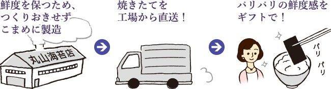 海苔の味を最後に決めるのは職人の「焼き」の技術。ごく少量ずつ、低温でゆっくりと時間をかけて焼き上げることで、香ばしさと綺麗な焼き色の海苔に仕上げています。