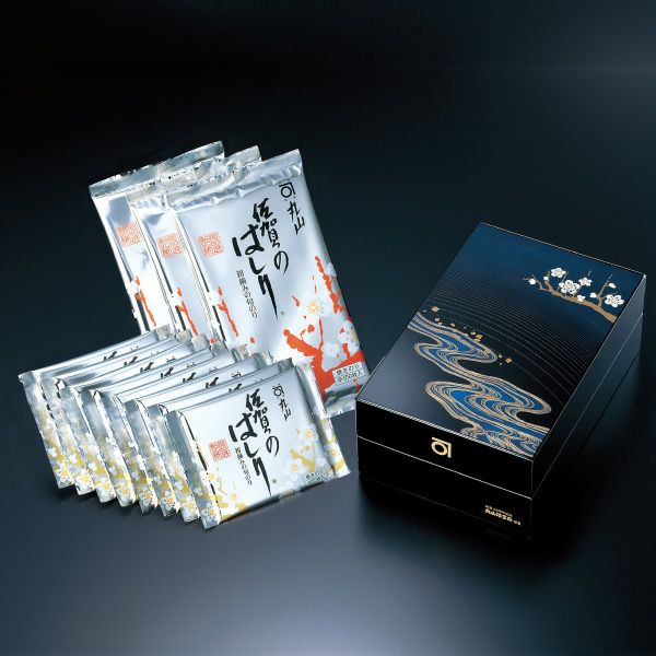 パリ オペラ座 歌舞伎公演の引き出物に使用された品。農林水産大臣賞受賞の初代 彦兵衛(四切サイズ)と極上佐賀のはしり(半切サイズ)を加賀蒔絵入りの漆箱に詰めました。