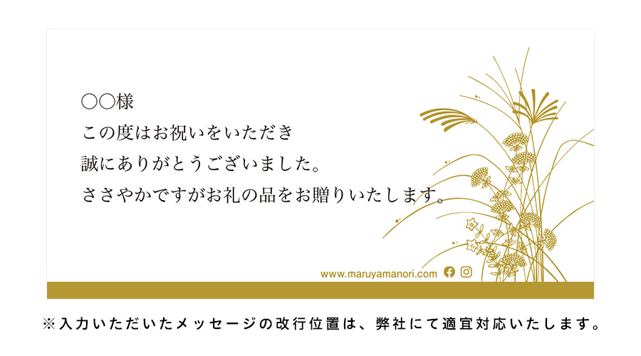 熨斗の種類は(丸山オリジナル熨斗または一般熨斗)ご購入時にお届け先情報を入力する際、お選びいただけます。尚、オリジナル熨斗は一部の商品にのみ対応可能です。