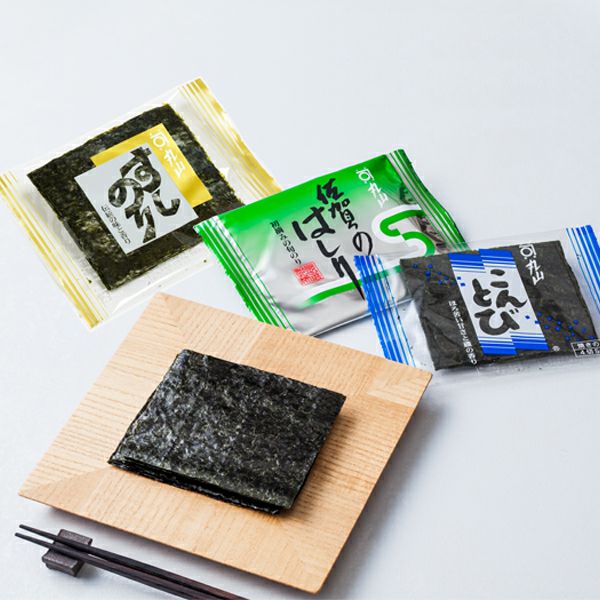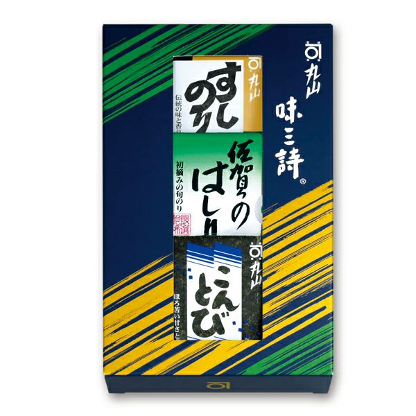 「すしのりゴールド」「佐賀のはしりグリーン」「こんとびブルー」の3種類の四切サイズの海苔を詰め合わせました。それぞれの海苔の色・味・香りの違いをお楽しみいただけます。
