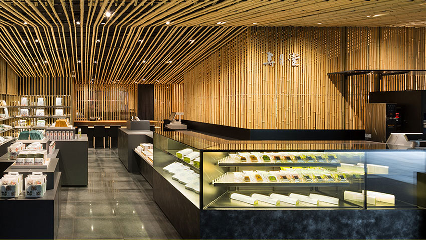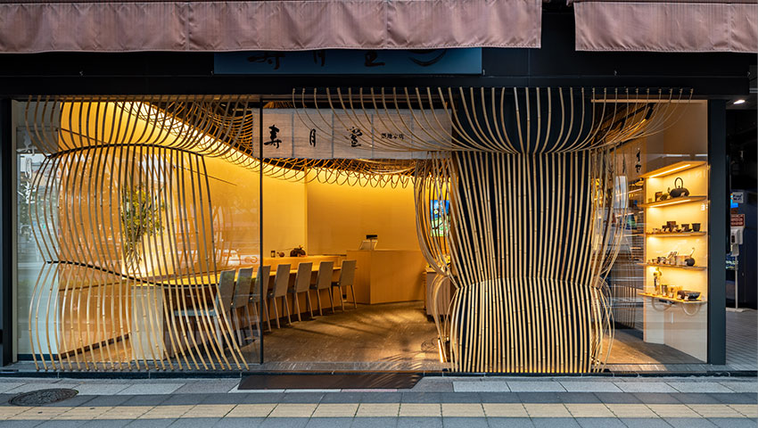 竹の野点傘にインスパイアされて茶禅の精神を空間化した。千利休に原点があるとされる野点は、作法よりもゲストをもてなす心を⼀番としており、現代に茶禅の精神を息づかせ続ける寿月堂の柔軟なふるまいと共鳴している。