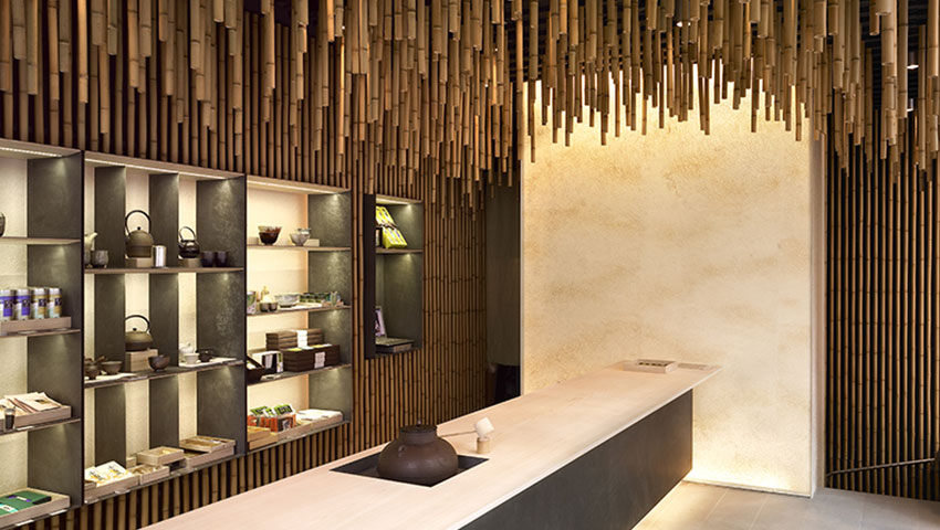 歌舞伎座の屋上庭園に面する日本茶専門店。ピッチの異なる竹スクリーンで空間を柔らかく仕切り、屋上の日本庭園に突き出した庇と連続するように天井を「折る」ことによって、庭と室内とをつなぐ折り紙のような空間ができあがった。密度の異なる竹のレイヤーを幾重にも重ねていくことで、歌舞伎座と庭園を柔らかく接続する、竹林のような空間が生まれた。
