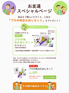 プレゼント品をカートに入れ、さらにホームページ内のお好きな商品を選び、注文手続きを完了してください。プレゼント品は、商品と同梱しお届けいたします。