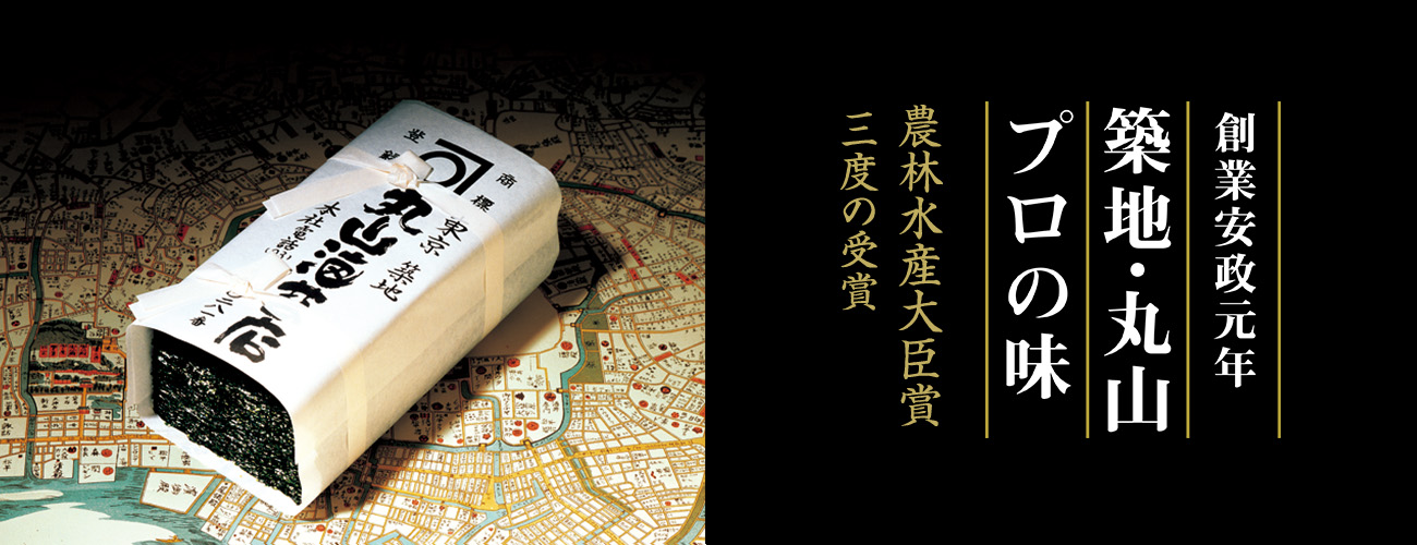 丸山海苔店は安政元年に産声を上げて以来170年。 海苔のうまさを磨きあげている築地の老舗です。高級寿司店を始め料亭、ホテルなど、味の玄人から信頼され育てられて参りました。 当店はプロの職人たちがこだわる産地や焼き方、色艶や歯切れの良さなど数々のご要望に応え、レストランガイド「ミシュラン東京」の三つ星寿司店を始め、関東一円3,000軒のプロにご使用いただいています。