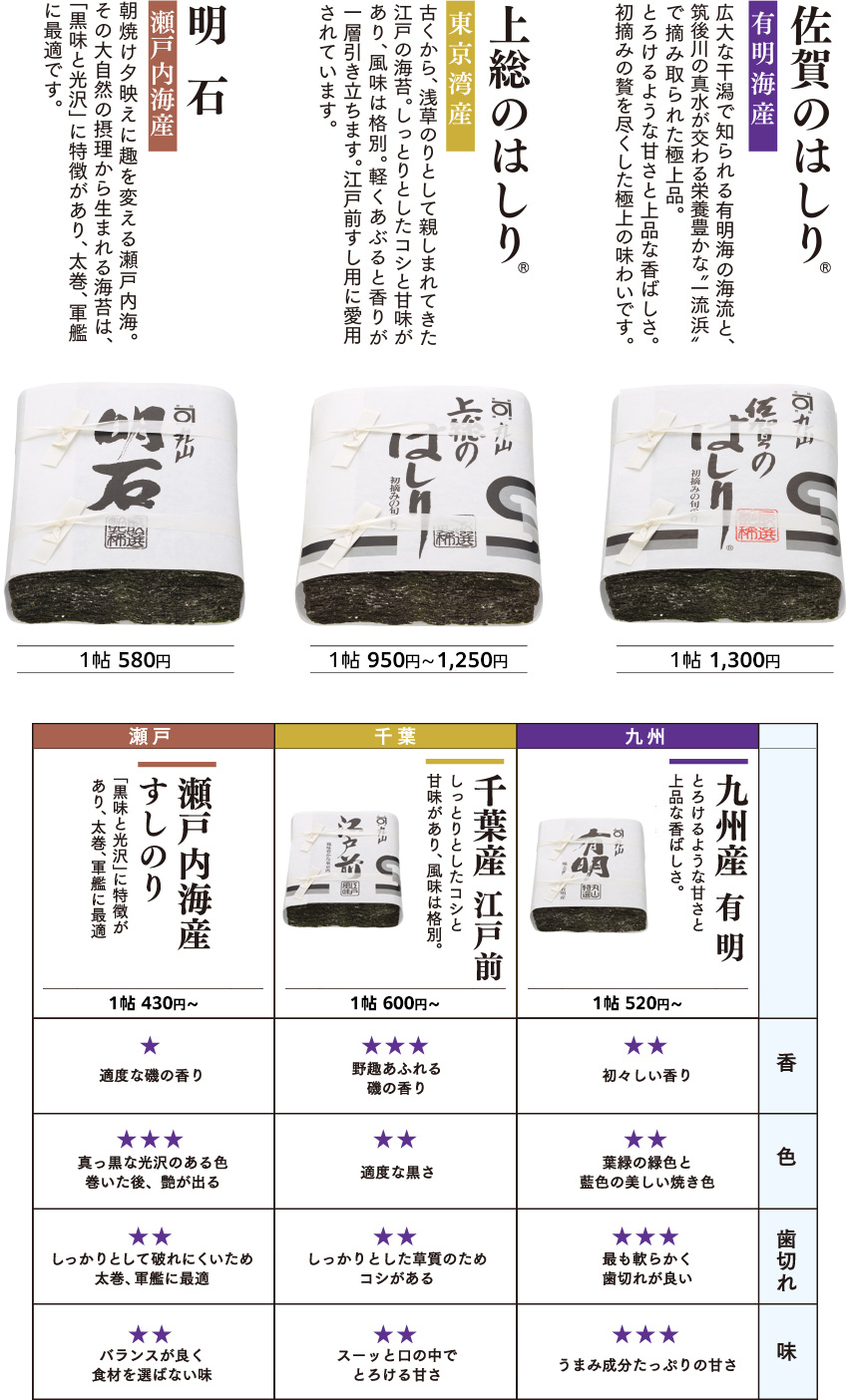 全国の主要漁場で採れる一番摘みの海苔を中心に、幅広い種類の海苔を取り揃えています。