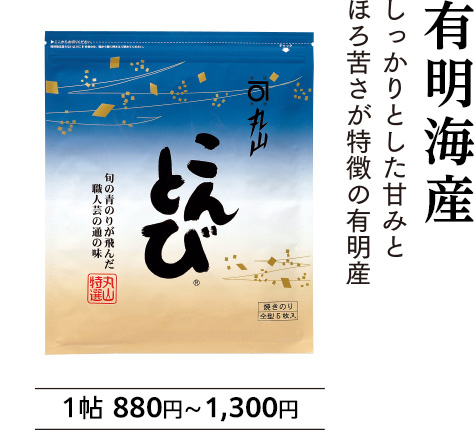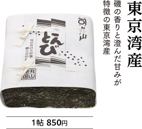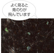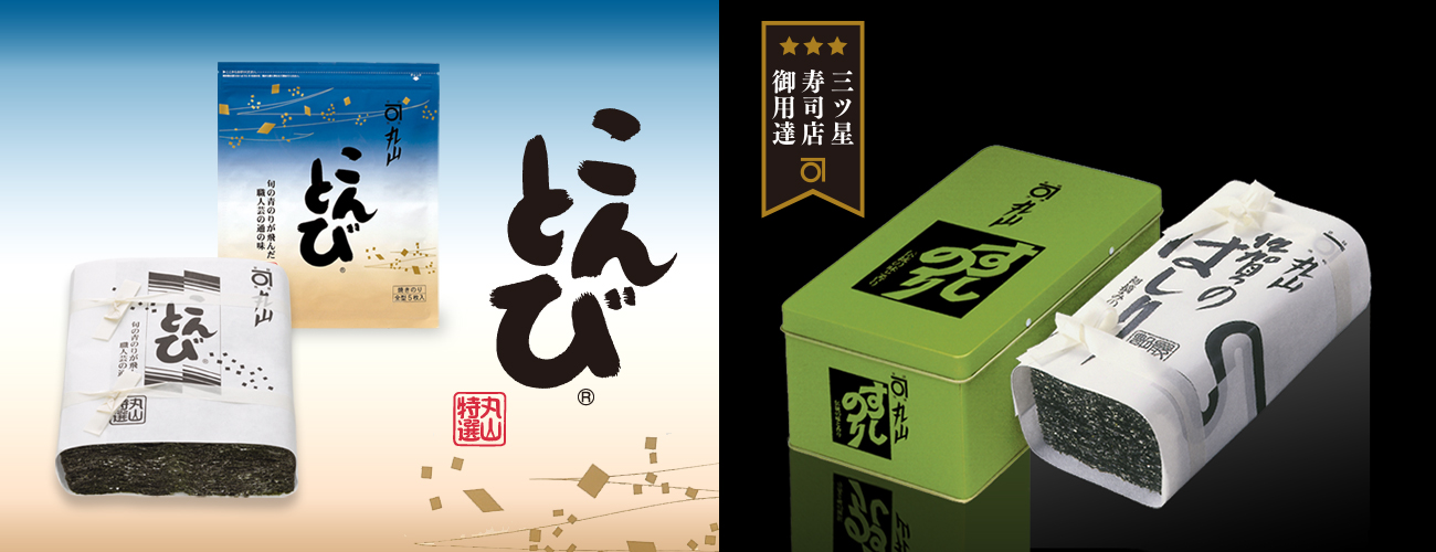 丸山の「こんとび」は海苔の格付け等級である「混(こん)」「飛(とび)」を商品名にしたもので、青のりが混ざった香りのある海苔です。多く混ざると「混」、少ないと「飛」と格付けされます。
