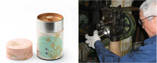 開閉時の滑らかさ、手触りの良さ、気密性の高さにこだわった茶筒は、創業明治43年の江東堂高橋製作所の職人の手作り。寿月堂のデザインを加えた和紙缶は繰り返しお使いいただけます。